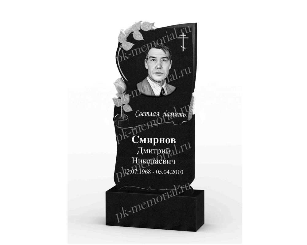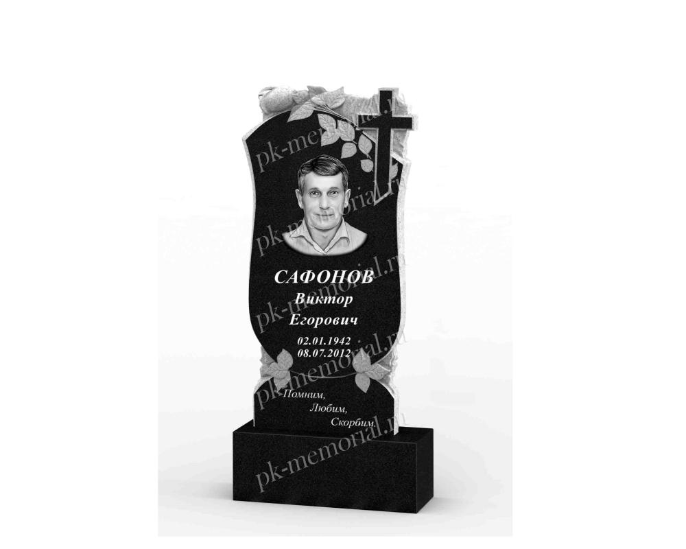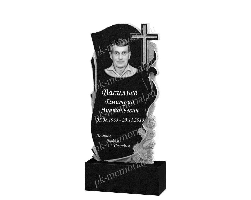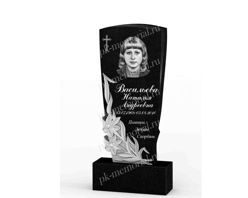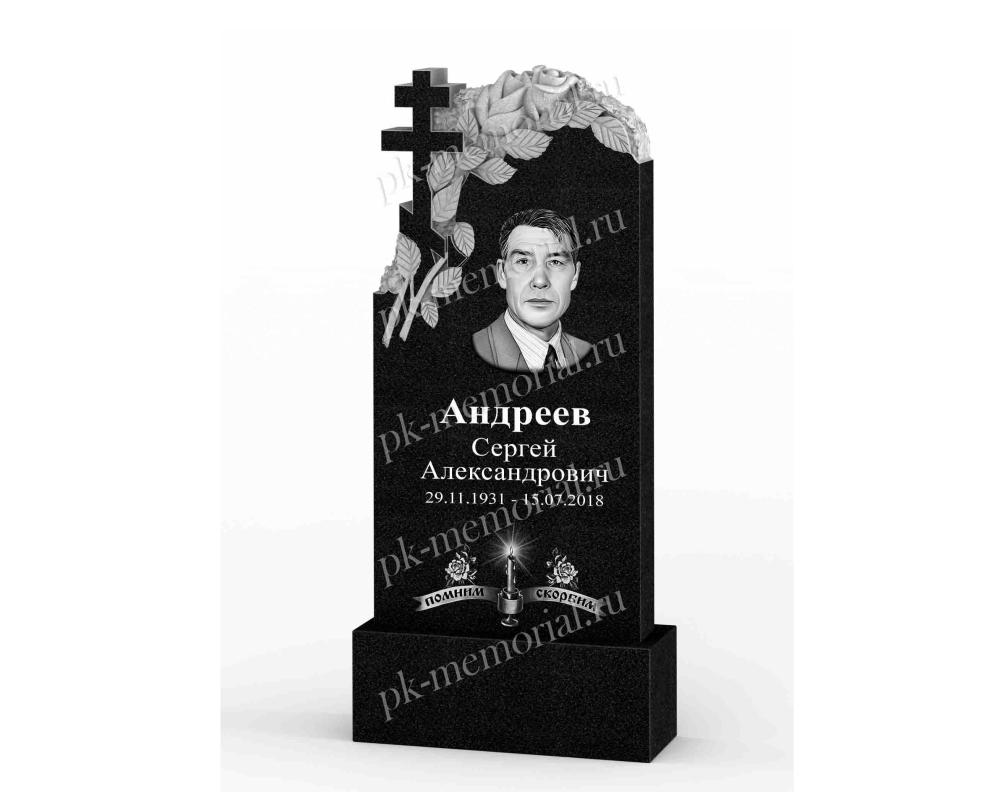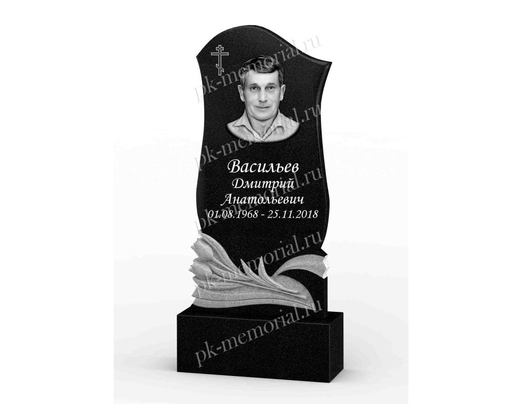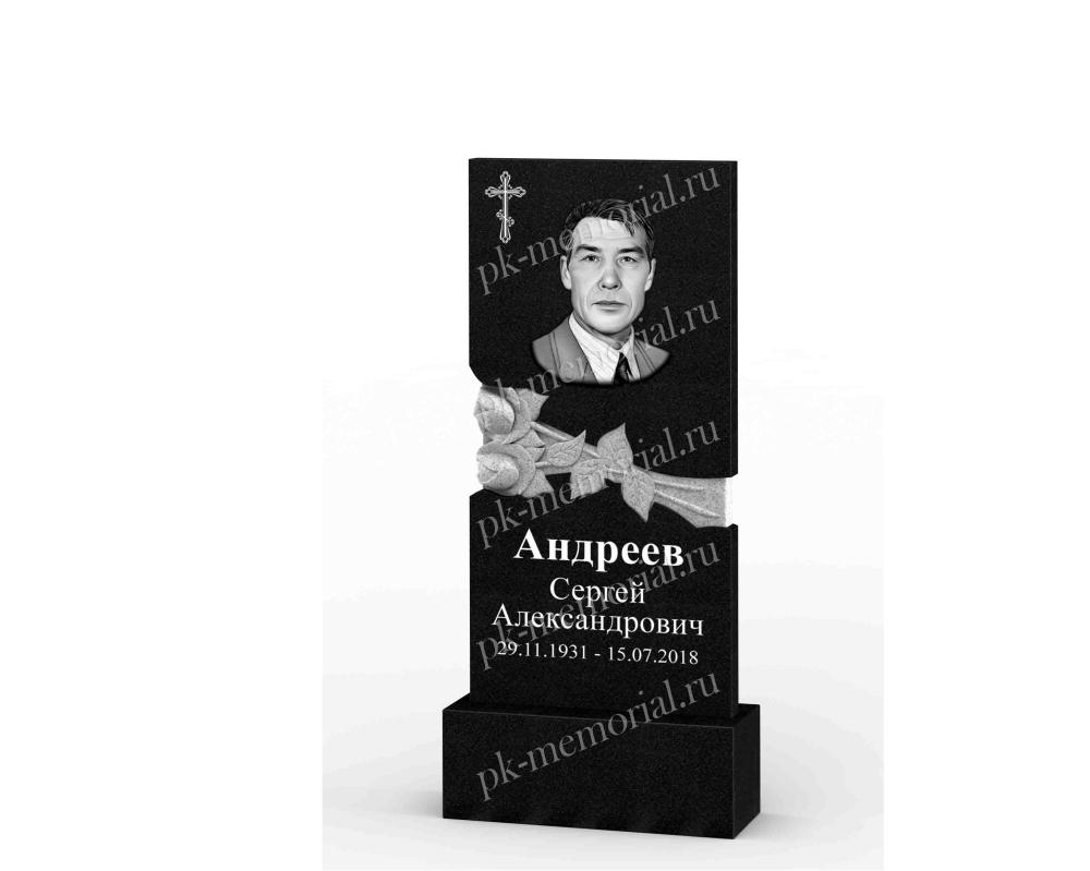Универсальный памятник из Карельского гранита, расположенный вертикально, прямоугольная форма с элементами резки. Подходит для оформление одиночного захоронения.