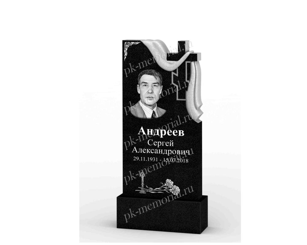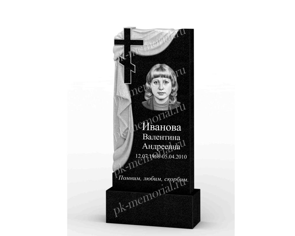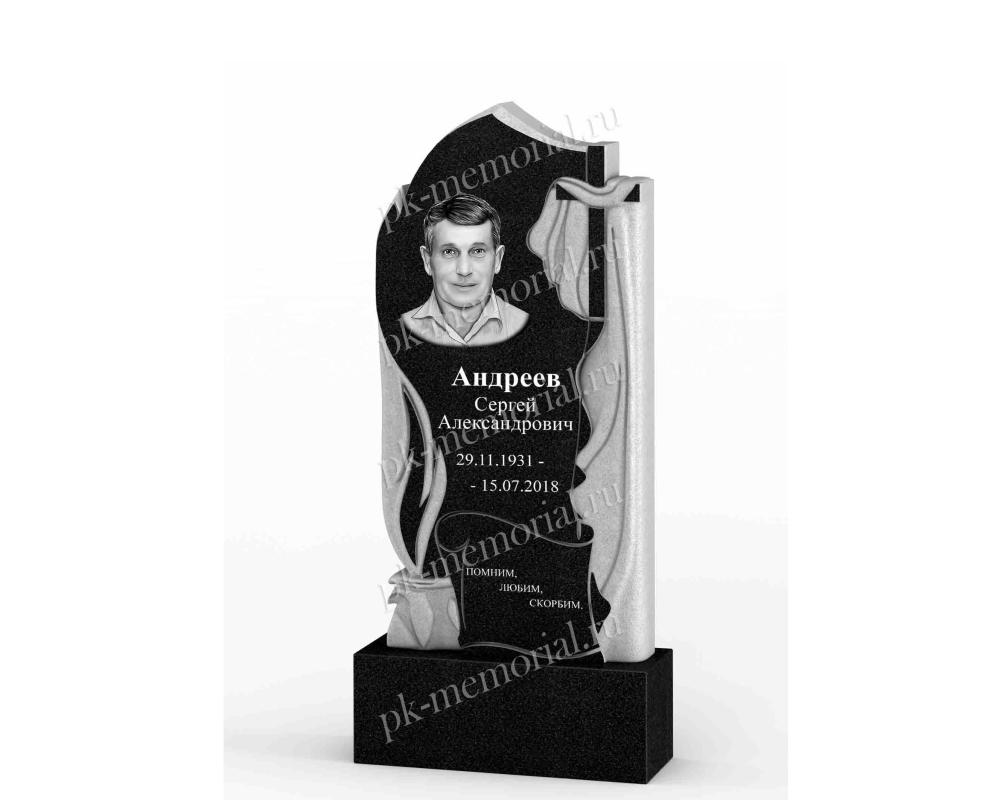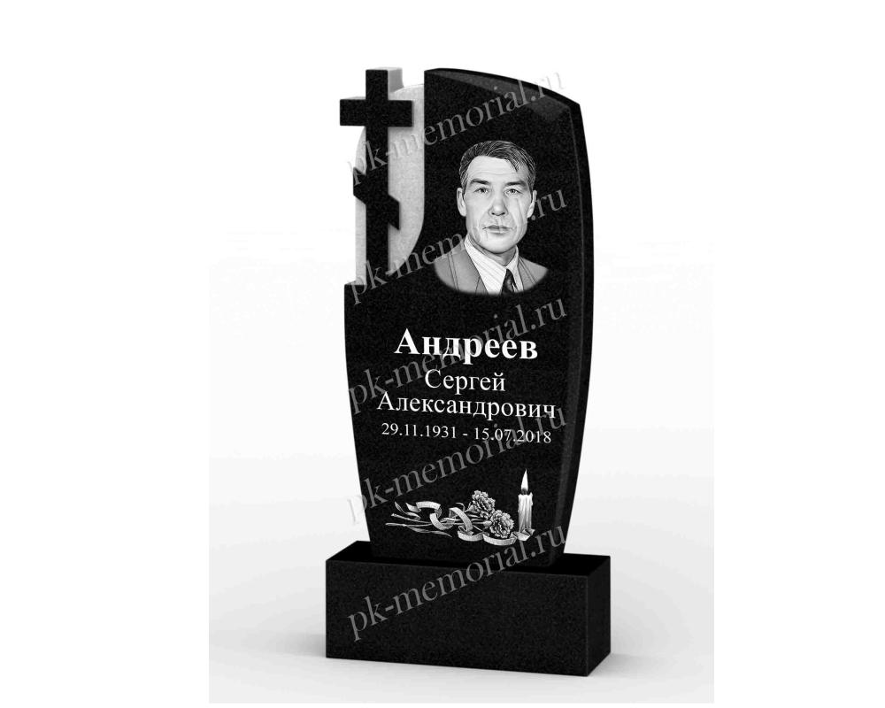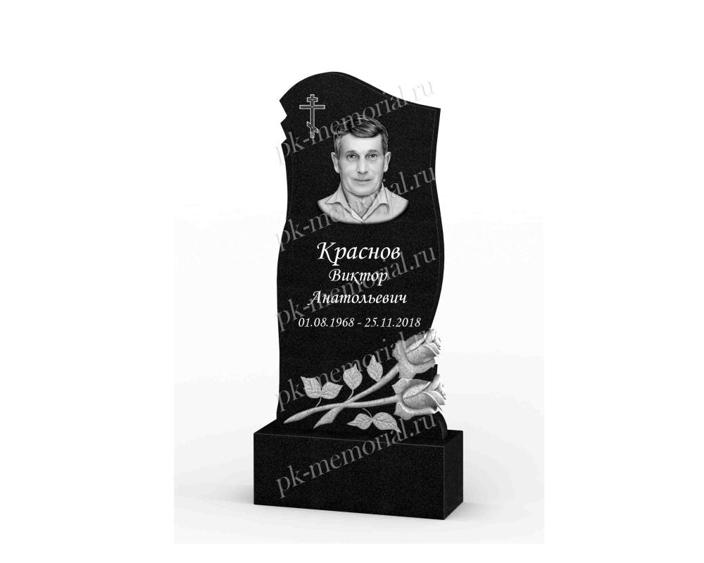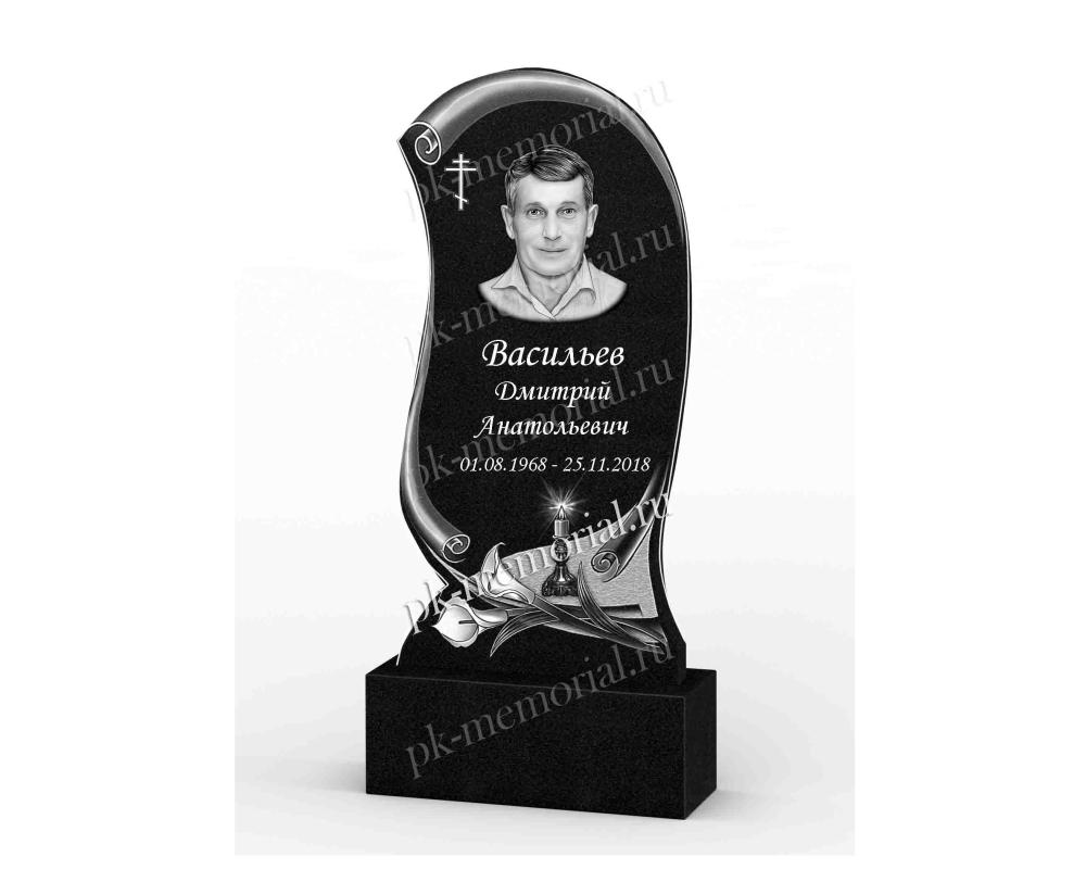 Универсальный памятник из Карельского гранита, расположенный вертикально, прямоугольная форма с элементами резки. Подходит для оформление одиночного захоронения.