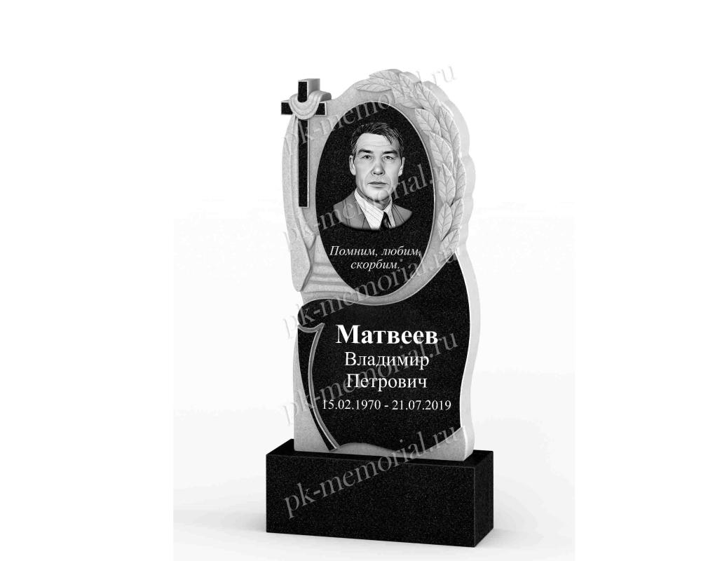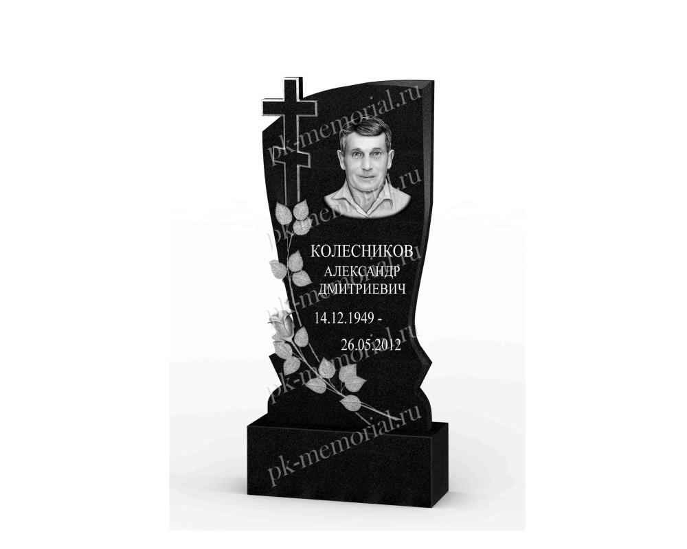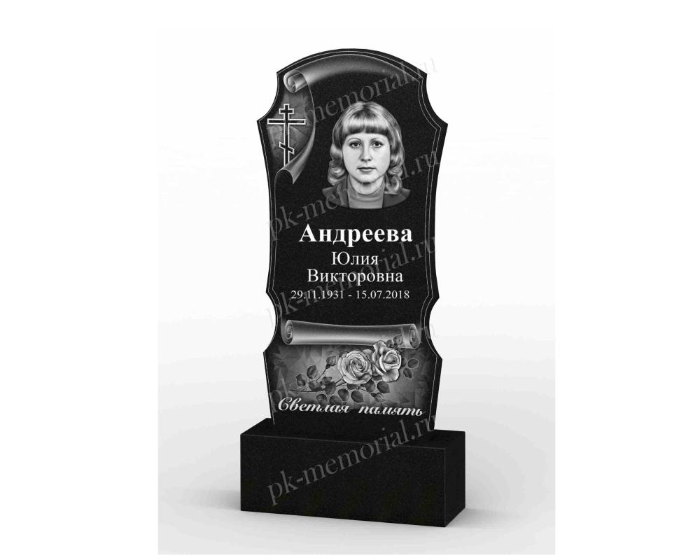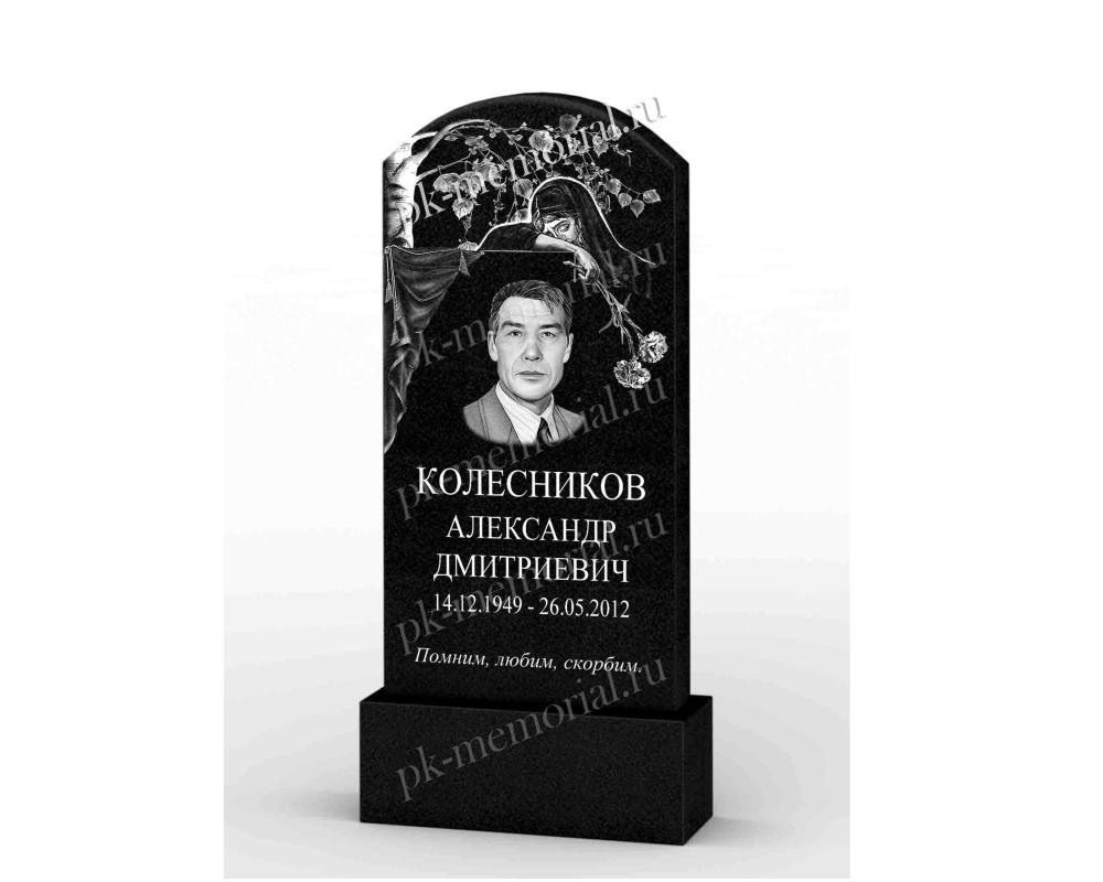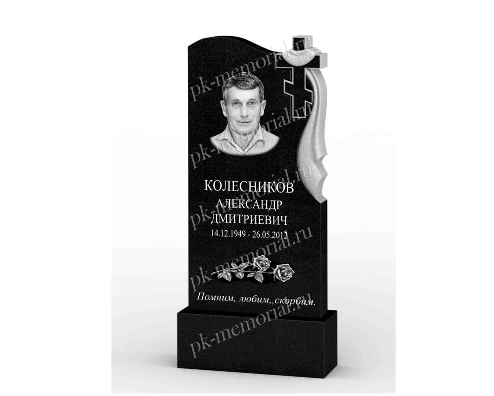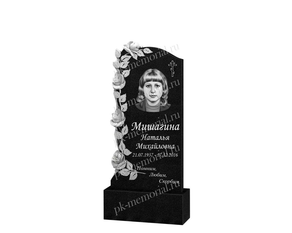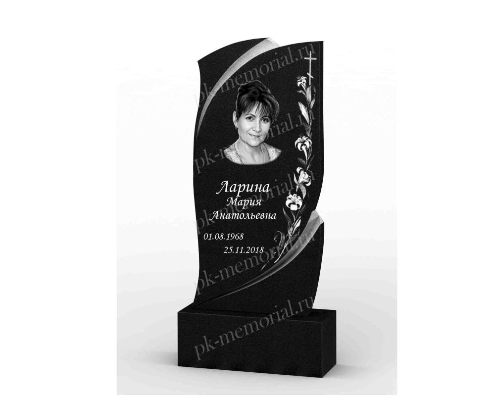 Универсальный памятник из Карельского гранита, расположенный вертикально, прямоугольная форма с элементами резки. Подходит для оформление одиночного захоронения.