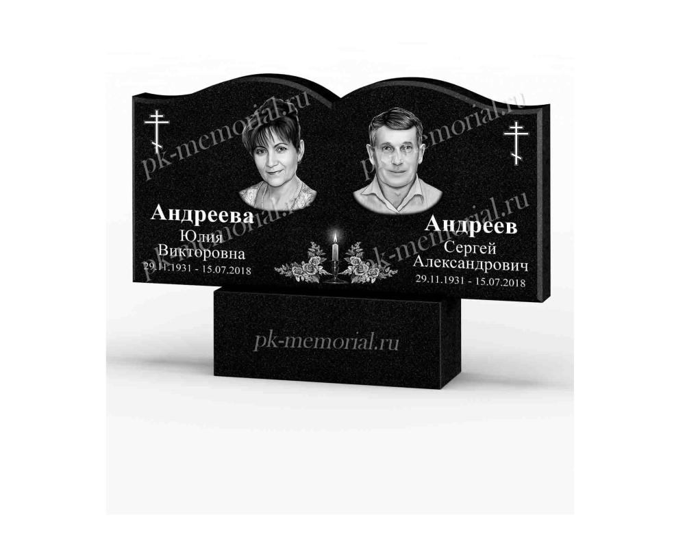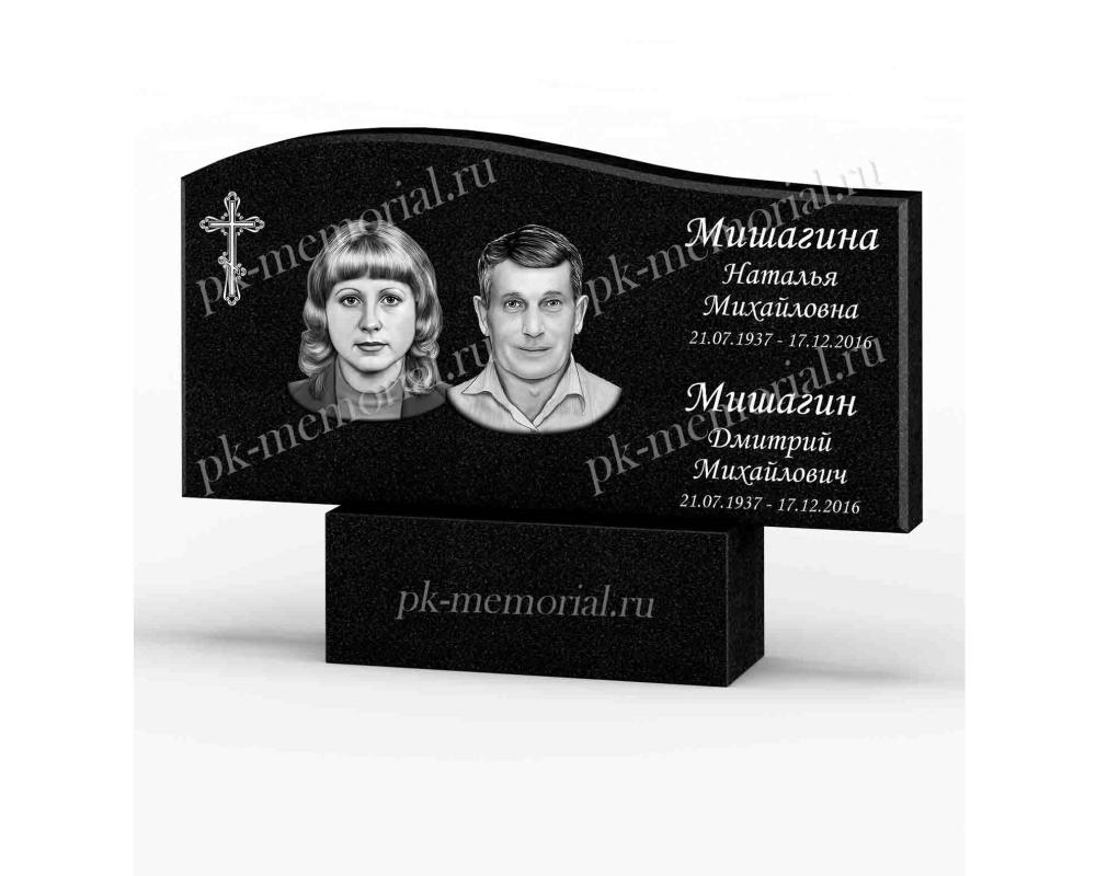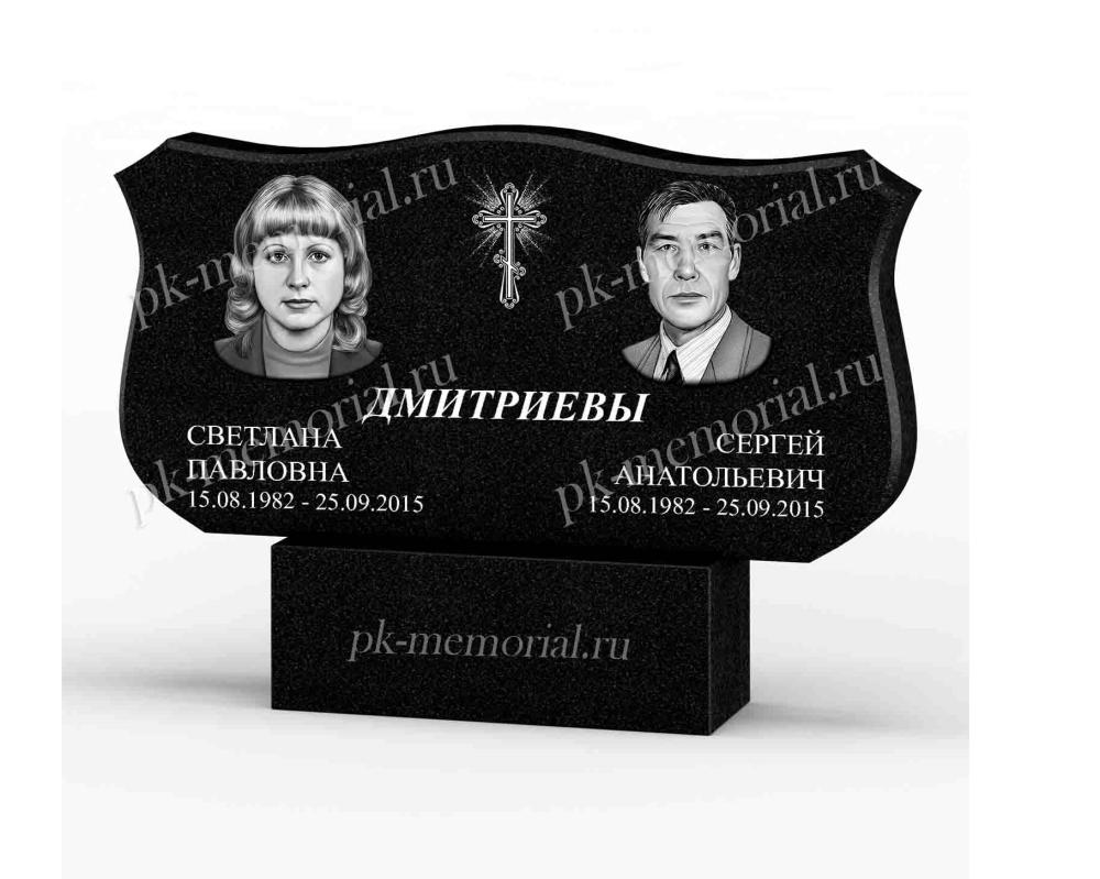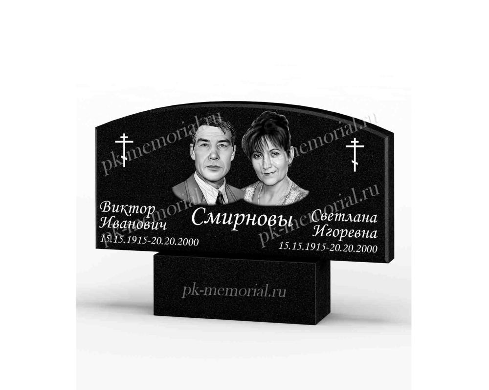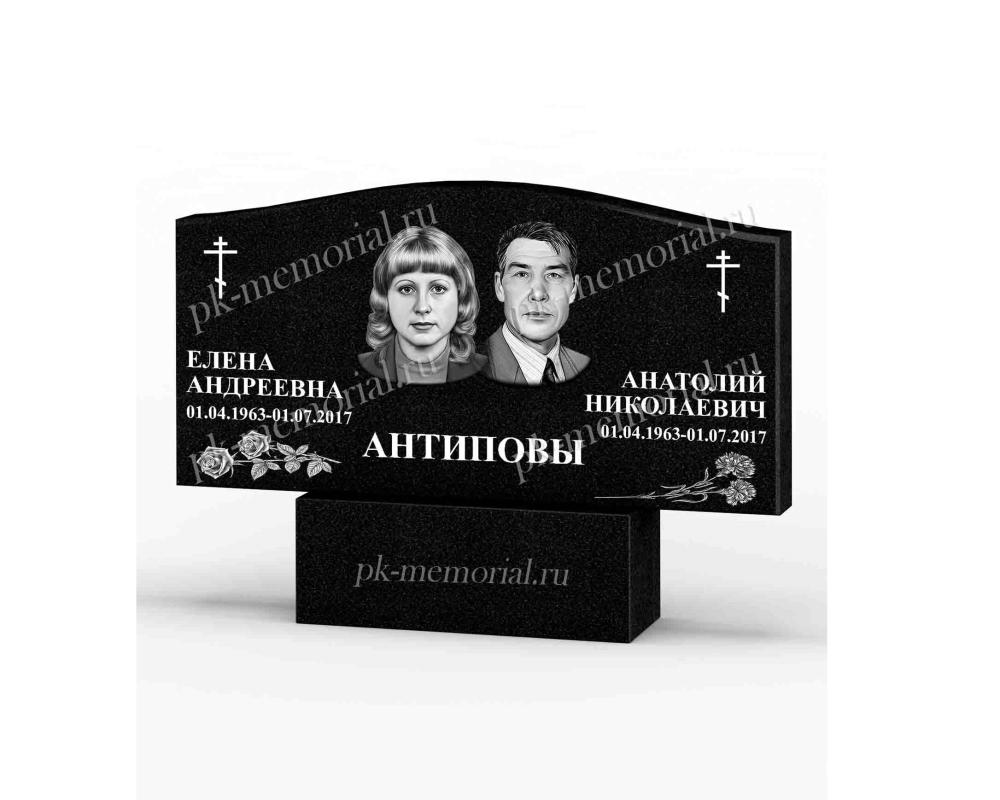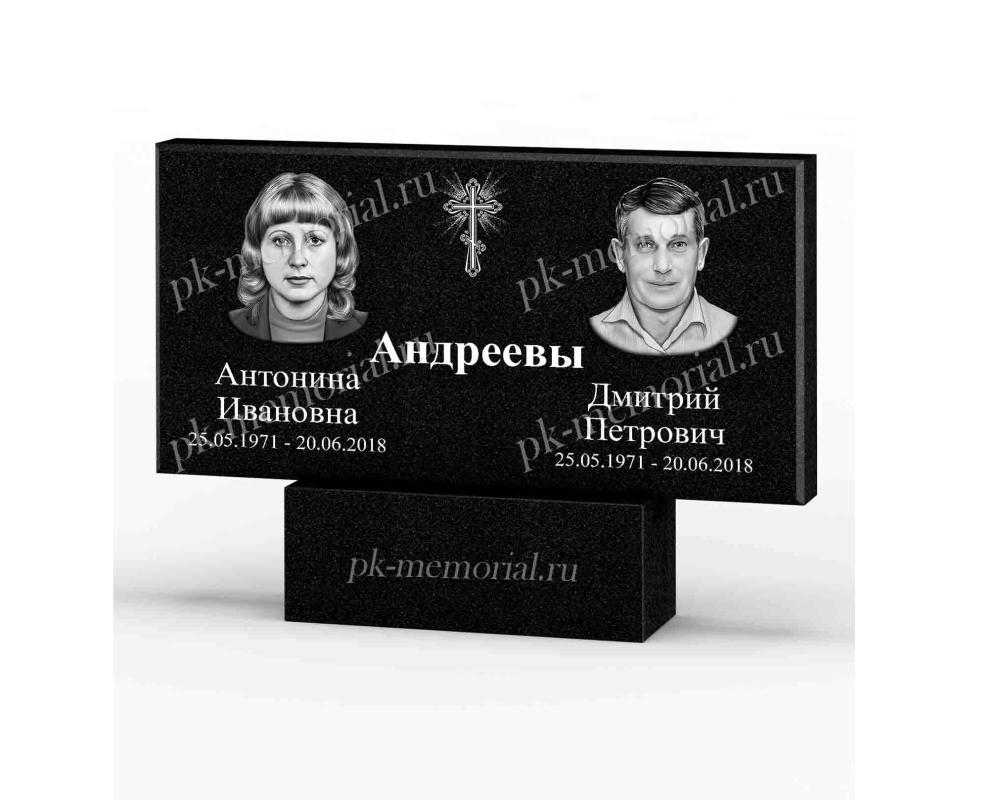 Универсальный памятник из Карельского гранита, расположенный горизонтально, прямоугольная форма с элементами резки. Подходит для оформление семейного захоронения для двоих и более человек.